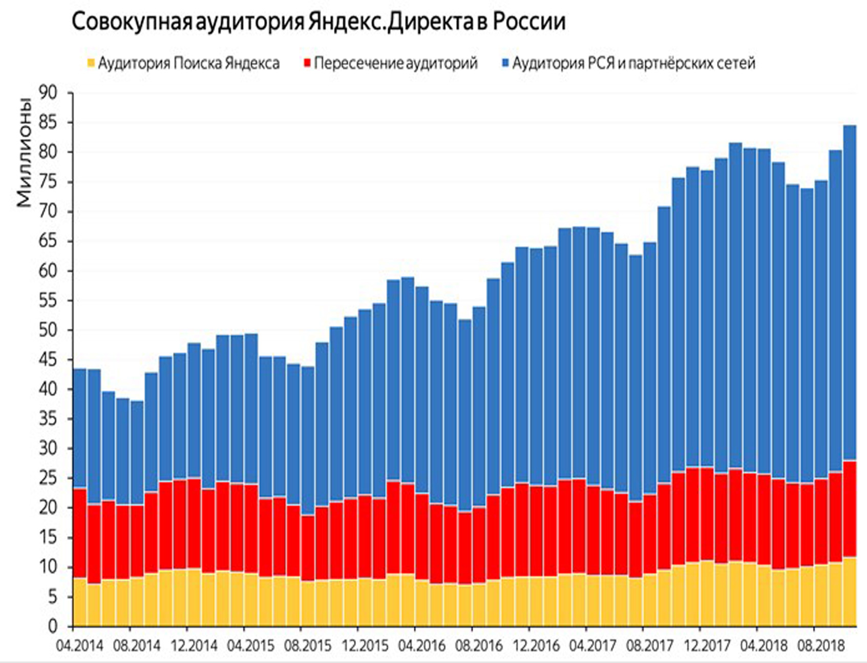 Аудитория Яндекса насчитывает миллионы человек. Реклама в Яндекс.Директе доступна пользователям в результатах поиска Яндекса, на площадках Рекламной сети и внешних сетей. Ниже представлен график, показывающий динамику роста аудитории Яндекс.Директа.