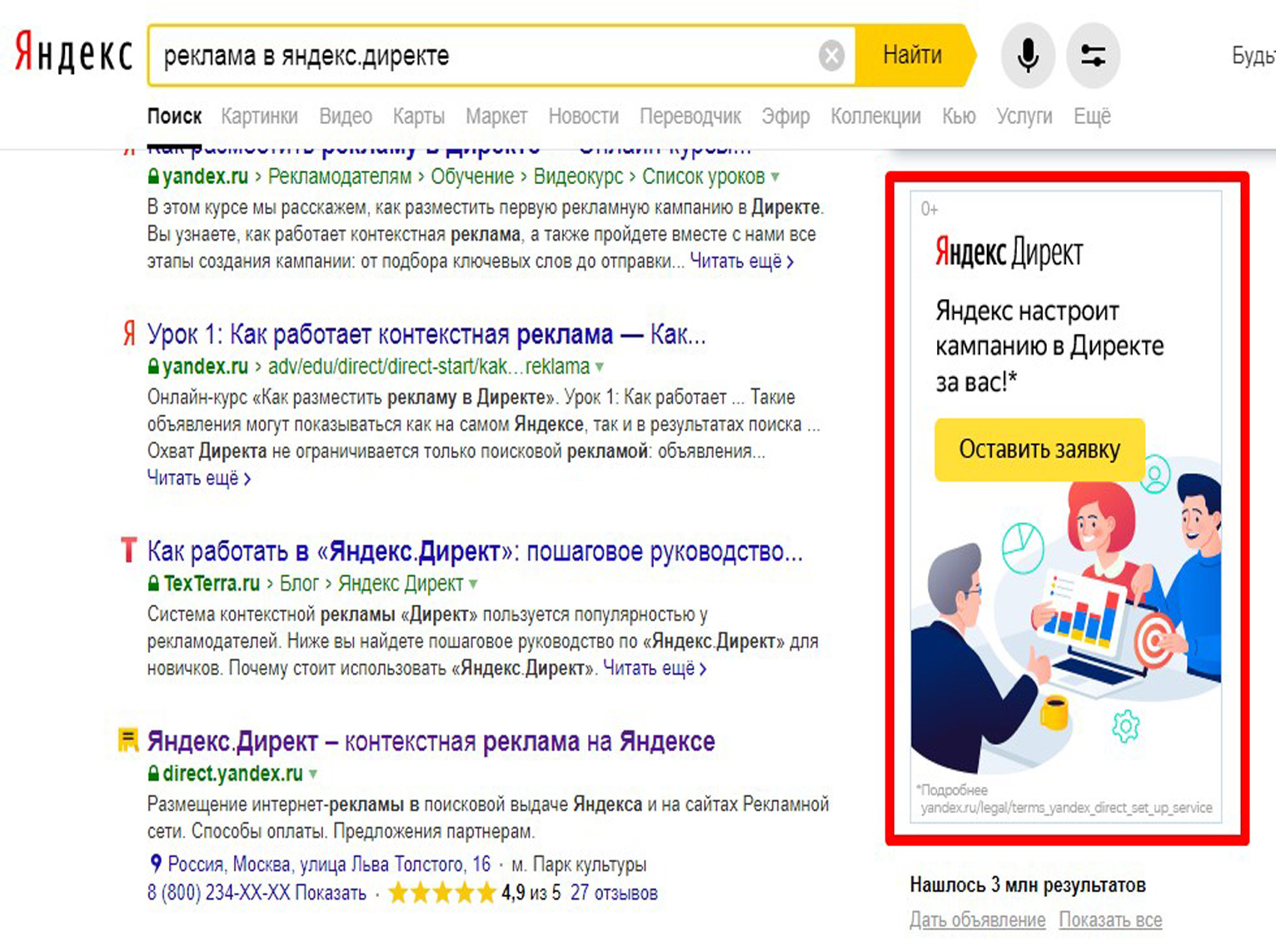 Пример текстовой рекламы в Яндексе представлен ниже: