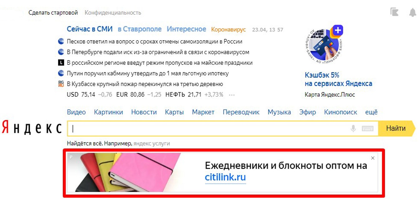 Пример баннера на главной странице в Яндексе представлен ниже:
